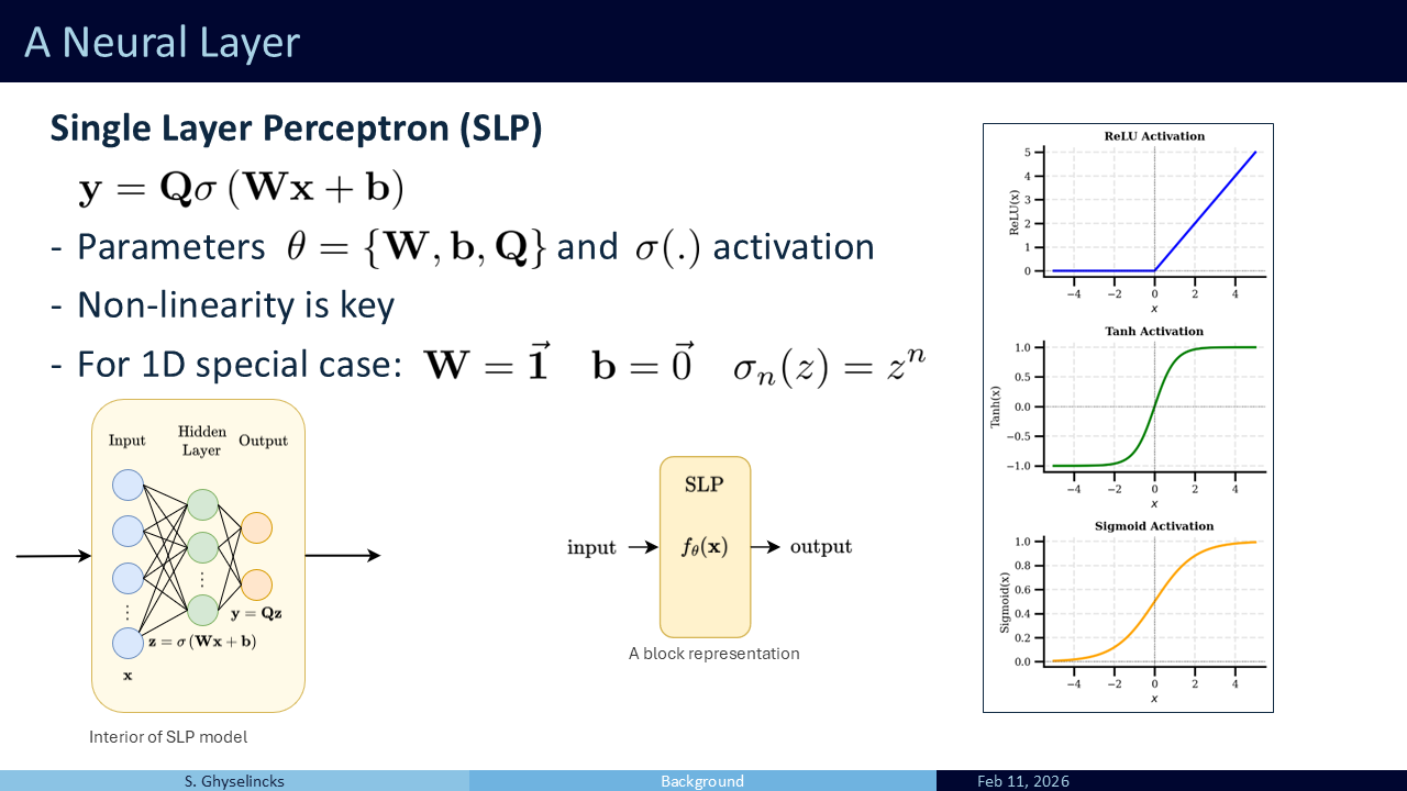 The Single Layer Perceptron (SLP) is a generalized approximation function. Inside, it applies a linear operation to the input \(\mathbf{x}\), yielding \(\mathbf{W}\mathbf{x} + \mathbf{b}\). Then, it passes that result through a non-linear activation function, \(\sigma(\cdot)\). A popular choice is ReLU, but generally, these functions are monotonically increasing with positive derivatives.