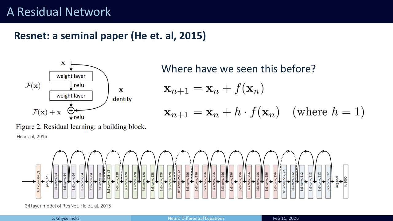 The architectural formulation from 2015 was trying to solve a vanishing gradient problem in optimization, but in the process it is structuring the model as learning difference steps. In 2017 work is published by Haber and Ruthotto providing the numerical methods analysis.