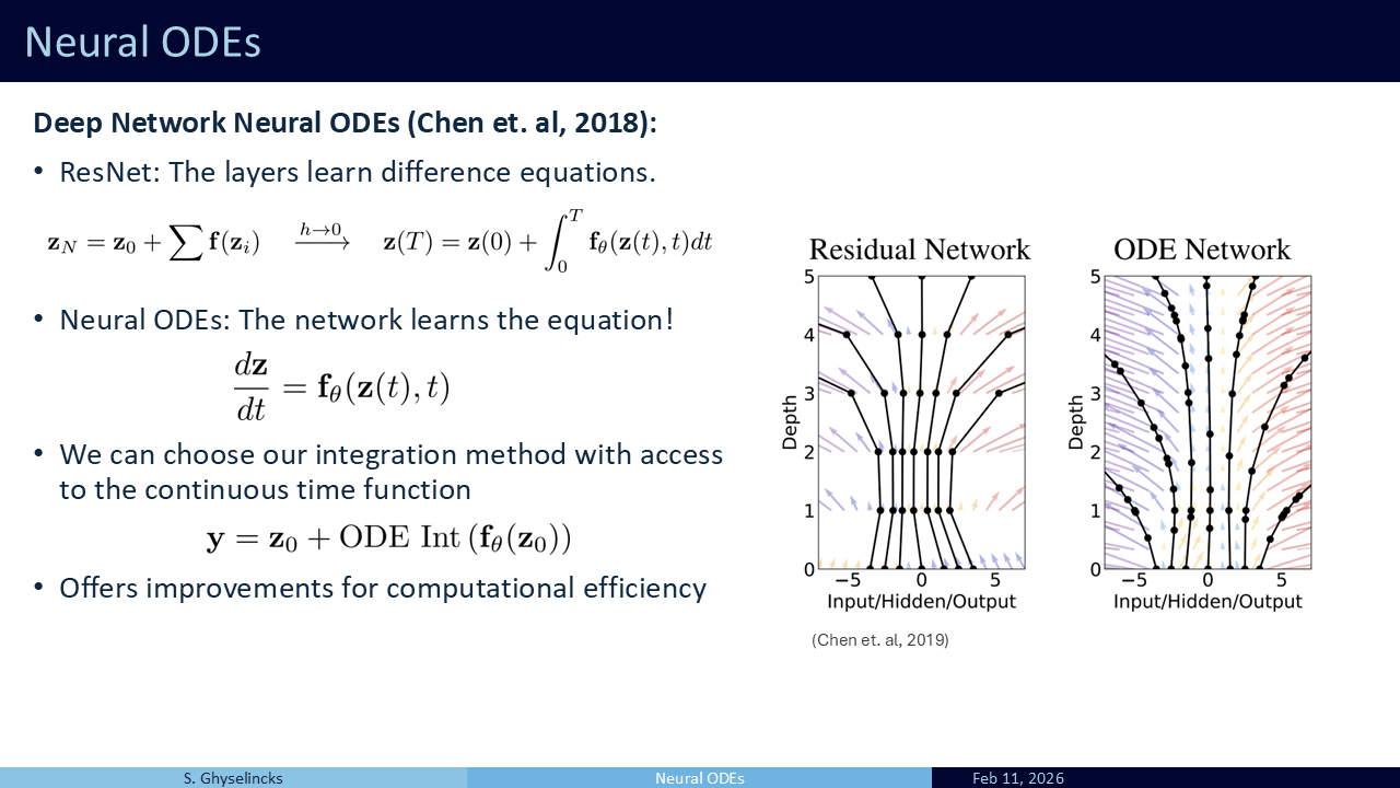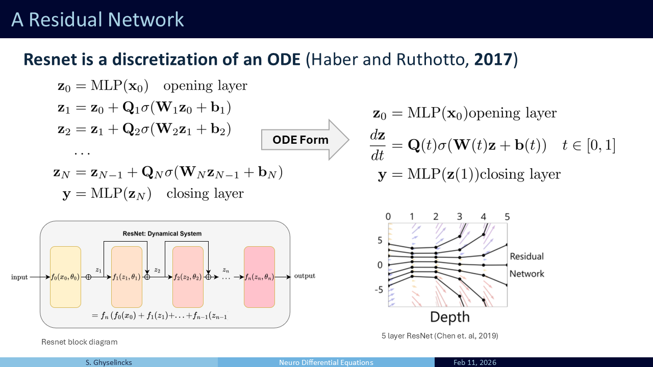 Part 2 looks at Neuro Differential Equations. With our foundational background established, we can explore how numerical analysis can inform the construction of deep networks. We will look at the celebrated ResNet architecture as well as two others that are inspired by the leapfrog integration scheme, as well as symplectic integration of hamiltonian systems.