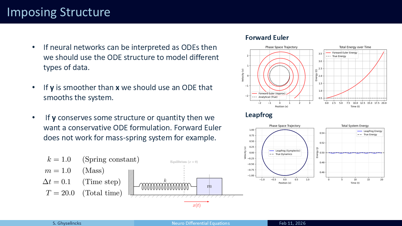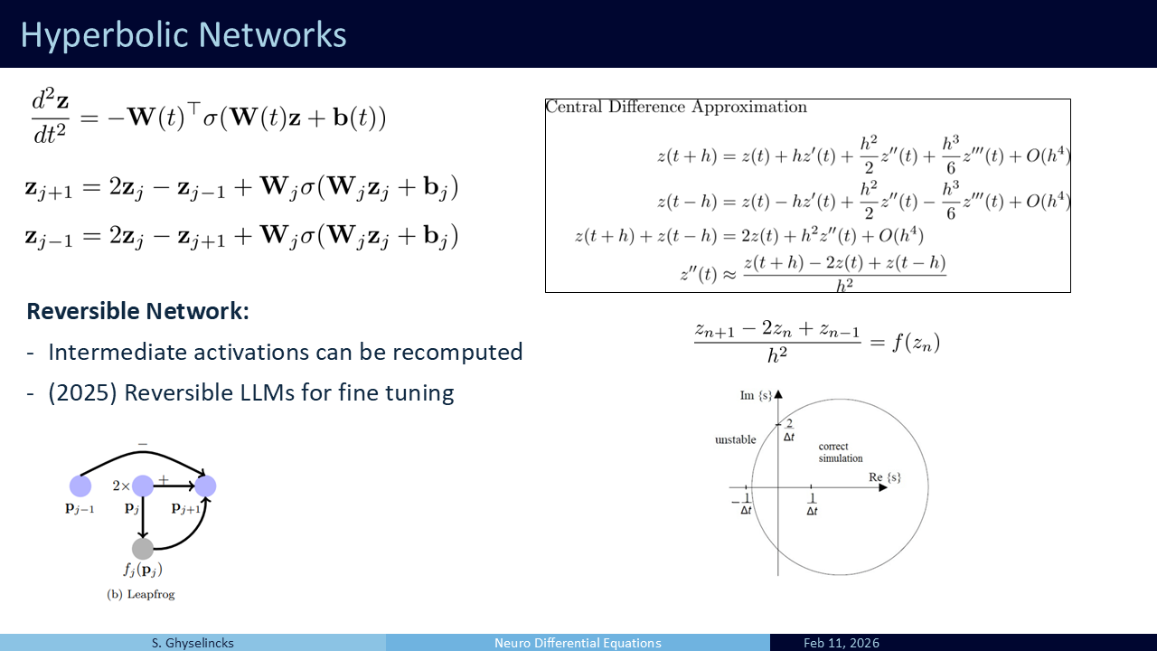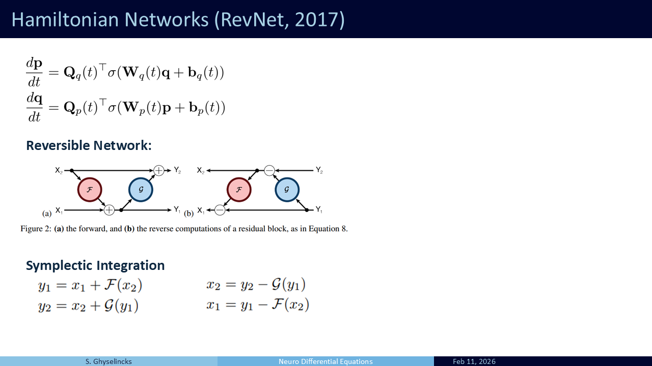 Going back to the Hamiltonian network, this is the inspiration for using symplectic integration. This is a semi-implicit method, as the updated value for \(y_1 = x_1\) is used in the middle of the two step process. Also has energy conservation properties, reversible, memory efficient– serves as an alternative to leapfrog Used in a lot of research including a recent paper from our group on LLMs, (Gal et al. 2025).