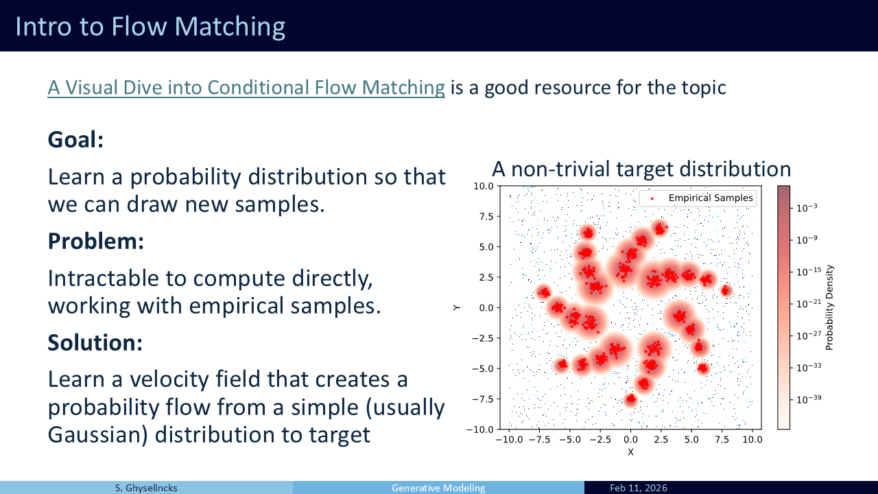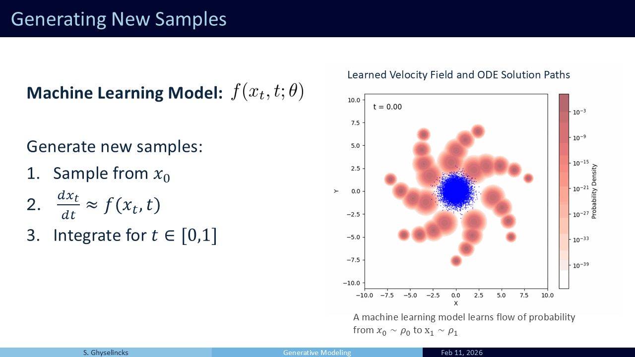 Solution: instead what we do is “push” samples from a known distribution (Gaussian) to our target distribution through a velocity field (Lipman et al. 2024). This avoids the partition function.