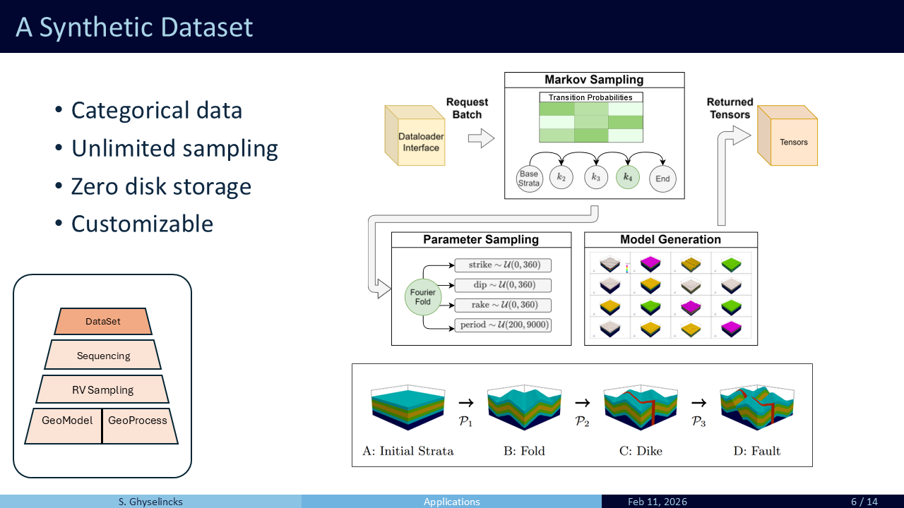 - The synthetic dataset is designed to rapidly sample geology using a Markov sequence of parameterized geological operations such as folds, dikes, faults sequenced in different orders with varying parameters.