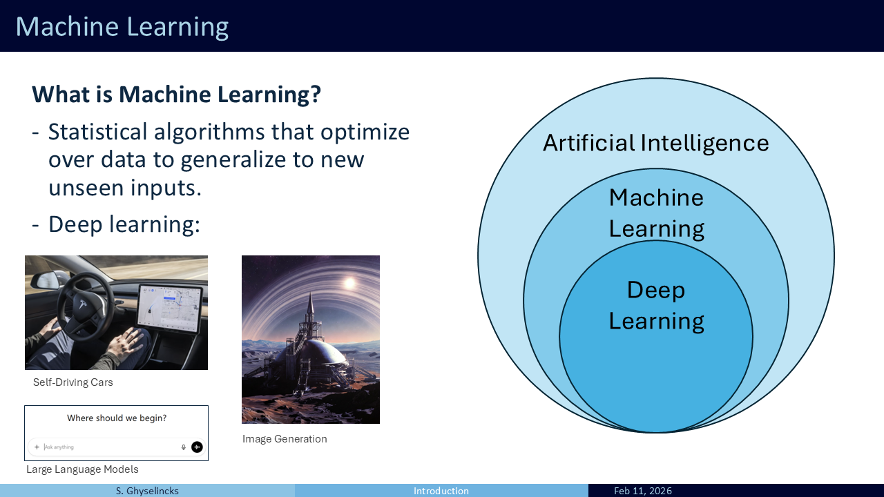 Machine learning encompasses statistical algorithms that “learn” from data, generalize to unseen inputs, and make new predictions or perform tasks without explicit, hard-coded instructions. It is a broad field. While it includes advanced deep learning tools like self-driving car algorithms (computer vision, control policies) and Generative AI (image generation, LLMs), it also includes traditional methods like decision trees, curve fitting, and data mining. Fundamentally, machine learning is about interpolation and extrapolation on data, which makes it closely linked to interpolating polynomials and numerical methods.