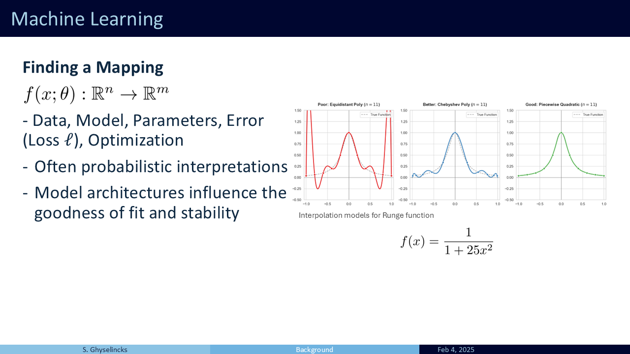 The choice of mathematical model directly influences the goodness of fit and the network’s ability to interpolate or extrapolate to new data. Similar to choosing a numerical solver, the stability and generalization to unseen data is of concern. We want to design architectures that are stable, robust to noise, and that do not over-fit to exisitng data. I start with the Runge function (\(f(x) = \frac{1}{1+25x^2}\)) because it provides a classic example of a mathematicl model that overfits to the available data points creating large error in the interpolated region. There are good choices and bad choices for a model.