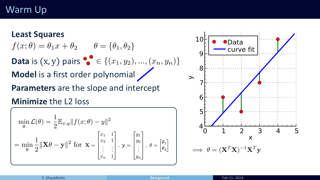 Let’s look at Least Squares as a warm-up. It is a simple model with just two parameters: slope \(\theta_1\) and intercept \(\theta_2\). We take data pairs, model them as a single line, and find the “best fit” by minimizing the L2 loss. This is equivalent to a first-order polynomial interpolation problem, but now the problem is overdefined with more than two points, so it is not possible to perfectly pass through all points.