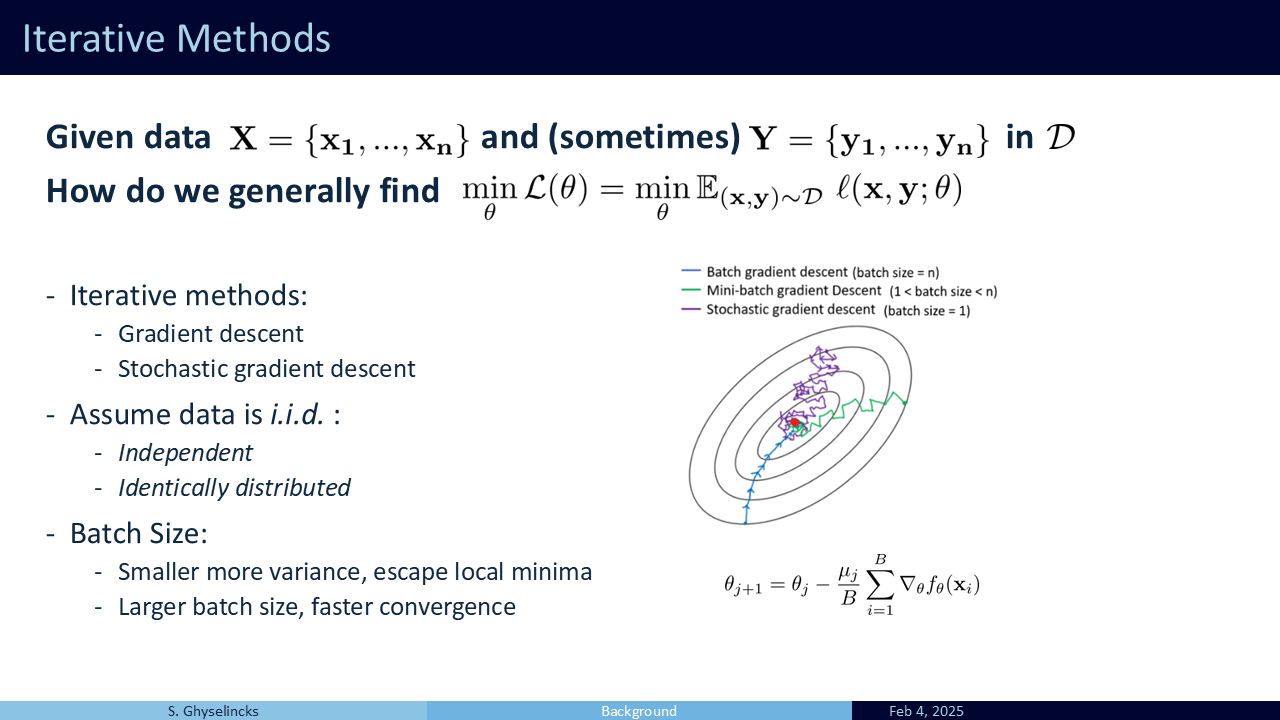 In practice stochastic gradient descent provides an unbiased estimator for the gradient using only a batch or subset of \(\mathcal{D}\) at each step. The smaller the batch size, the greater the variance of the estimator. To do this we make some assumptions on the data. We want to minimize the overall loss which is the expectation of loss over all individual samples. Invoking an “often incorrect” assumption of i.i.d. We treat the samples like drawing numbers from a hat.